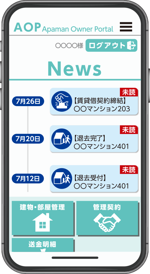 オーナー様へのお知らせやアンケート、セミナー等のイベントのご案内、各種ご確認事項を掲載します。また、賃貸経営関連のお役立ち情報等もお届けします。